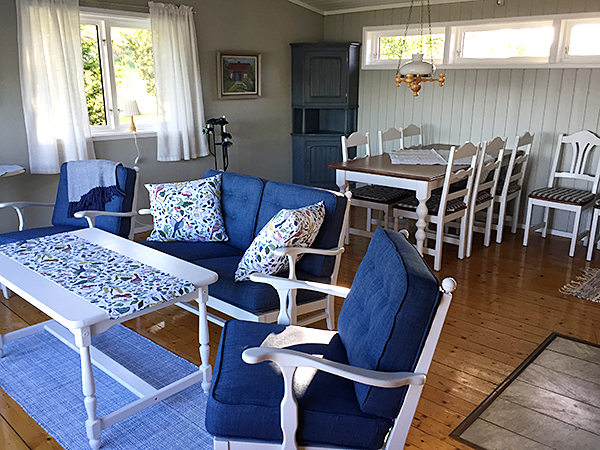 Övriga utrymmen har en öppen planlösning med kök, matplats och vardagsrum med braskamin. I direkt anslutning till stora huset ligger två extra sovrum (ingen dörr mellan rummen) med vardera 2 bäddar.